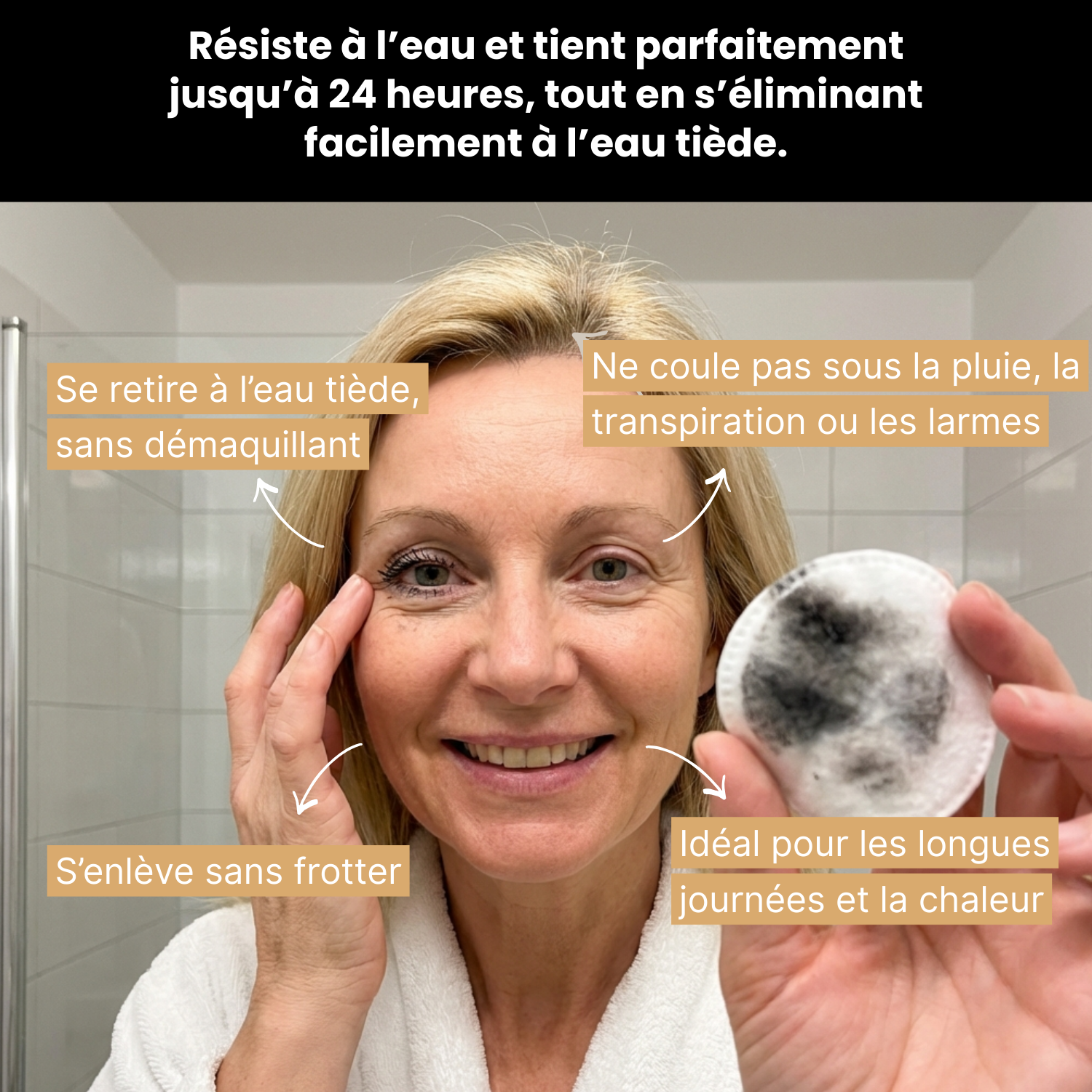 Résiste à tout : eau, transpiration, larmes et humidité. Tenue impeccable pendant 24 heures sans la moindre coulure.